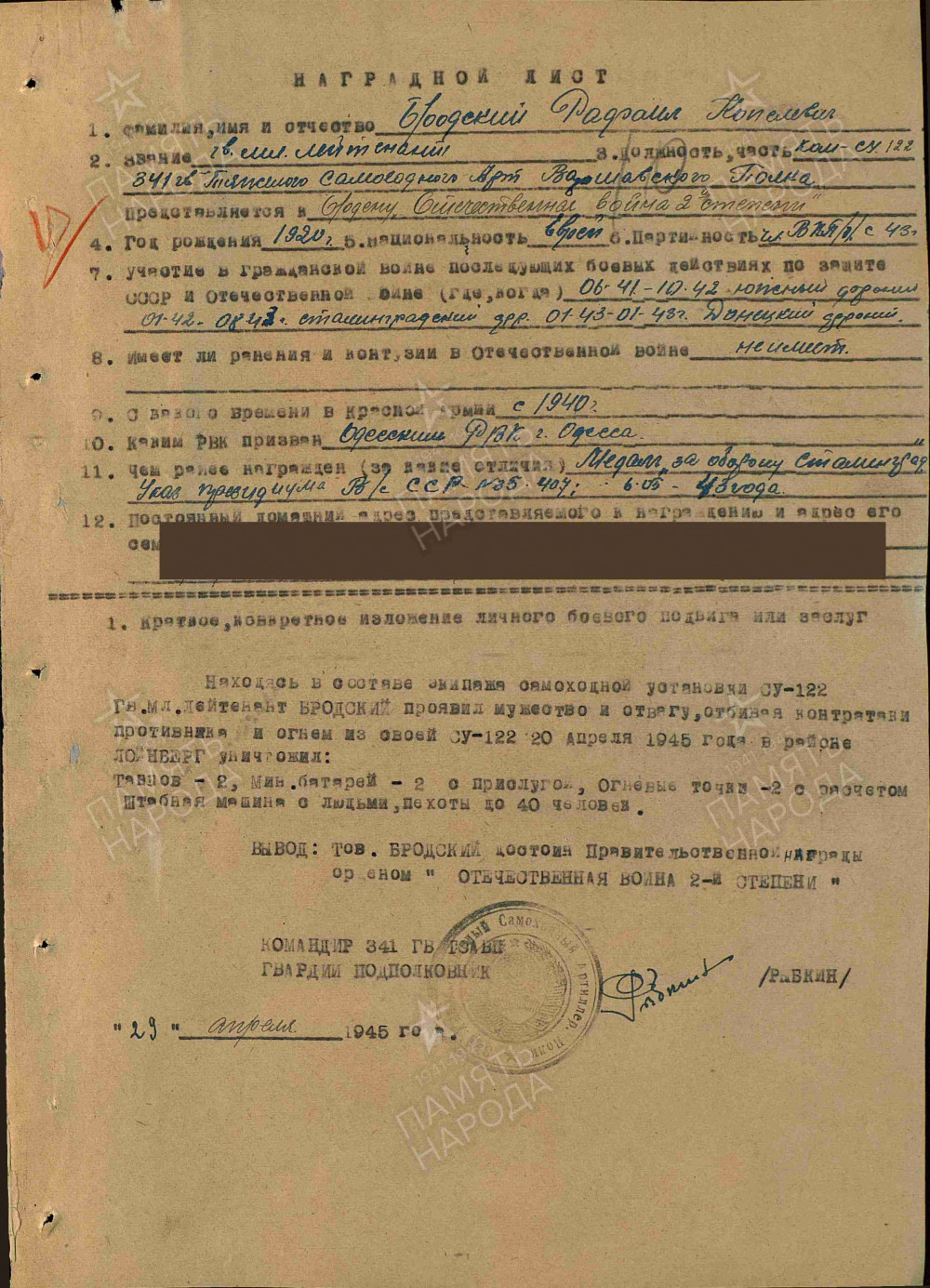 | Дополнительные сведения Рафаил Копелевич Бродский родился в 1920 г. в Одессе. В некоторых документах отмечено, что там же он был призван в армию в 1940 г. В других документах есть сведения, что к началу 40-х годов его семья проживала в г. Тульчин Винницкой области Украины, и в армию Рафаил был призван Тульчинским горвоенкоматом в мае 1940 г.