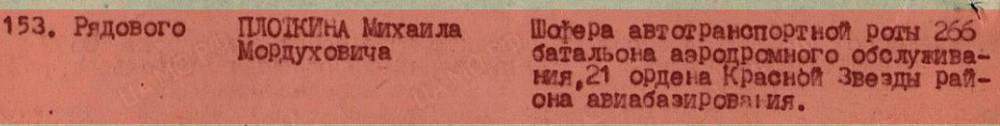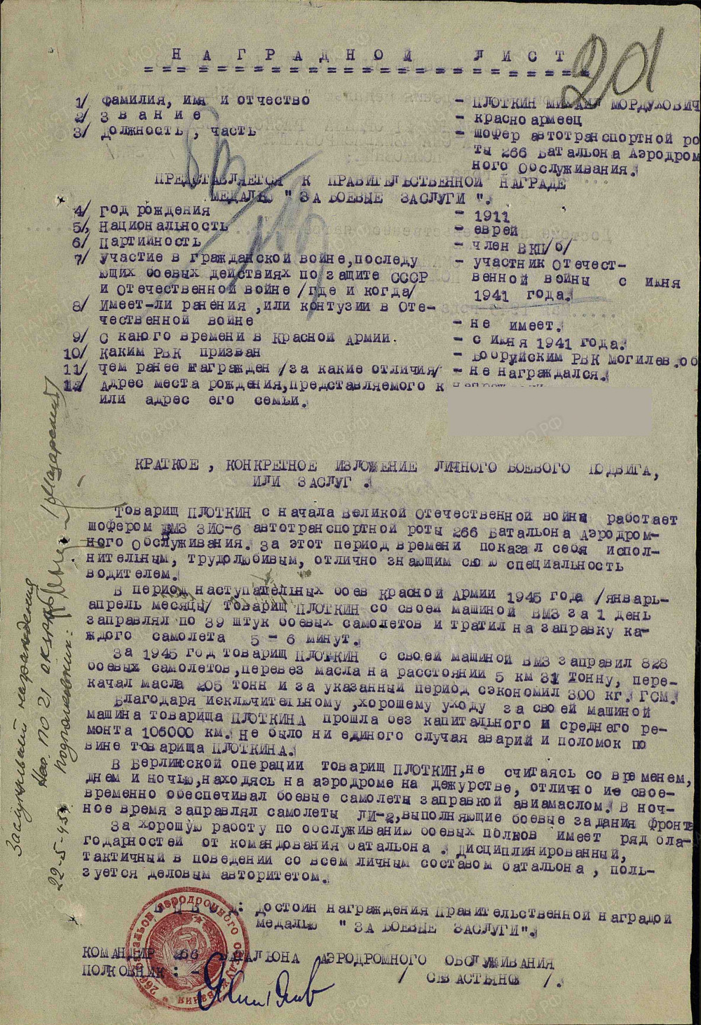 "Товарищ ПЛОТКИН с начала Великой Отечественной войны работает шофером ВМЗ ЗИС-6 автотранспортной роты 266 батальона аэродромного обслуживания. За этот период времени показал себя исполнительным, трудолюбивым, отлично знающим свою специальность водителем. В период наступательных боев Красной Армии 1945 года /январь-апрель месяцы/ товарищ ПЛОТКИН со своей машиной ВМЗ за 1 день заправлял 39 штук боевых самолетов и тратил на заправку каждого самолета 5-6 минут. За 1945 год товарищ ПЛОТКИН со своей машиной ВМЗ заправил 828 боевых самолетов, перевез масла на расстоянии 3 км 31 тонну, перекачал масла 205 тонн и за указанный период сэкономил 300 кг. ГСМ. Благодаря исключительному, хорошему уходу за своей машиной, машина товарища ПЛОТКИНА прошла без капитального и среднего ремонта 106000 км. и не было ни единого случая аварий и поломок по вине товарища ПЛОТКИНА. В Берлинской операции товарищ ПЛОТКИН не считаясь со временем, днем и ночью, находясь на аэродроме на дежурстве, отлично и своевременно обеспечивал боевые самолеты заправкой авиамаслом. В ночное время заправлял самолеты ЛИ-2, выполняющие боевые задания фронта. За хорошую работу по обслуживанию боевых полков имеет ряд благодарностей от командования батальона. Дисциплинированный, тактичный в поведении со всем личным составом батальона, пользуется деловым авторитетом. Достоин награждения правительственной наградой медалью "ЗА БОЕВЫЕ ЗАСЛУГИ". |