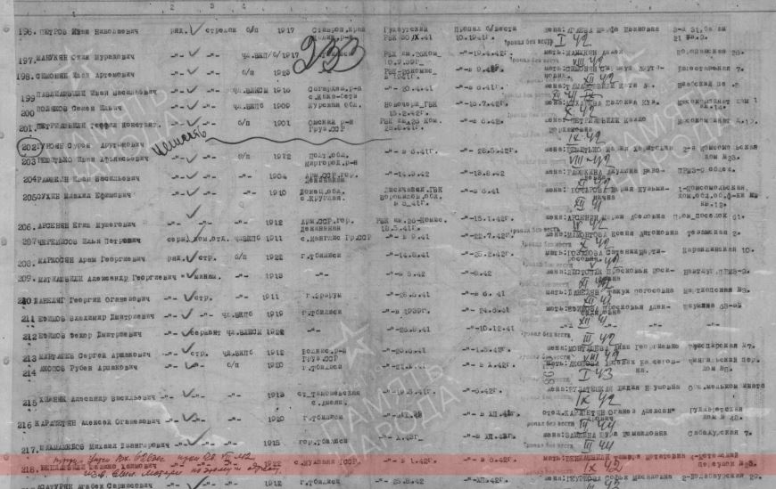 Документ, уточняющий потери Дата рождения: __.__.1922 Место рождения: Грузинская ССР, г. Тбилиси Наименование военкомата: им. 26 Комиссаров РВК, Грузинская ССР, г. Тбилиси, им. 26 Комиссаров р-н Дата и место призыва: им. 26 Комиссаров РВК, Грузинская ССР, г. Тбилиси, им. 26 Комиссаров р-н Дата призыва: 10.01.1942 Воинское звание: рядовой Дата выбытия: __.07.1942 Причина выбытия: пропал без вести Место призыва: им. 26 Комиссаров РВК, Грузинская ССР, г. Тбилиси, им. 26 Комиссаров р-н Информация об архиве - Источник информации: ЦАМО | |