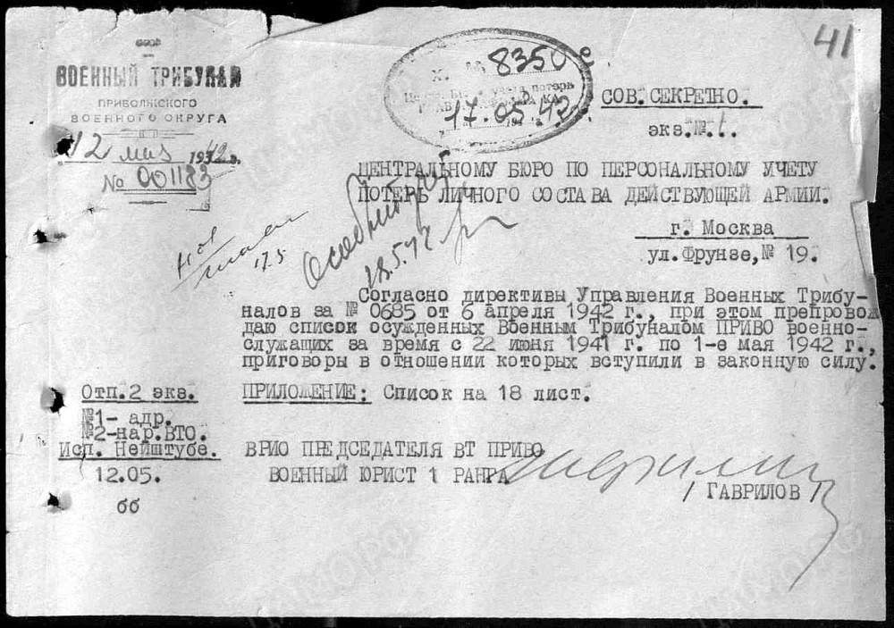Боевой путь 16 декабря 1941 г. осужден Военным трибуналом Приволжского военного округа (ВМН)