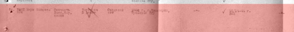 1902-1941. Место рождения: г. Евпатория, Крым. Призван: 23.06.1941. Военврач 3 ранга. Одесский военный госпиталь. Санчасть военно-морской школы. Приговор ВМН, 15.11.1941. /ЦАМО/ (АСЭ) |
