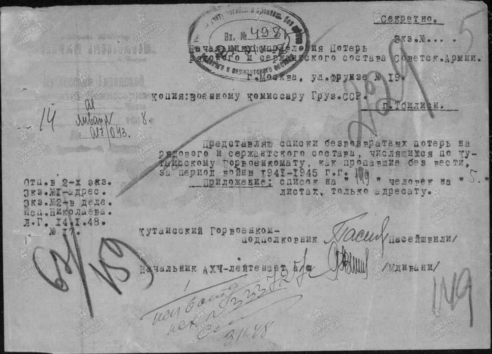 Документ, уточняющий потери Дата рождения: __.__.1917 Место рождения: Грузинская ССР, г. Кутаиси Наименование военкомата: Кутаисский ГВК, Грузинская ССР, г. Кутаиси Дата и место призыва: Кутаисский ГВК, Грузинская ССР, г. Кутаиси Дата призыва: __.09.1939 Воинское звание: красноармеец Дата выбытия: __.10.1941 Причина выбытия: пропал без вести Место призыва: Кутаисский ГВК, Грузинская ССР, г. Кутаиси Информация об архиве - Источник информации: ЦАМО | |