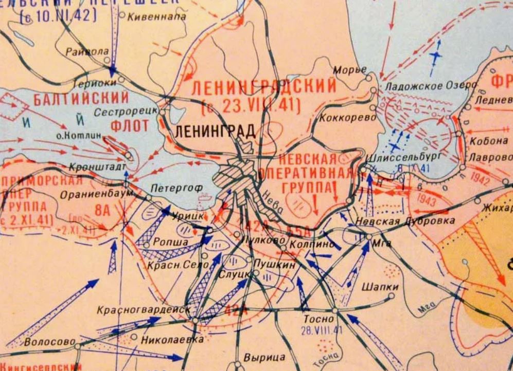 Войска 42 Армии - в центре на карте боевых действий по обороне Ленинграда (полоса от Финского залива до Колпино)