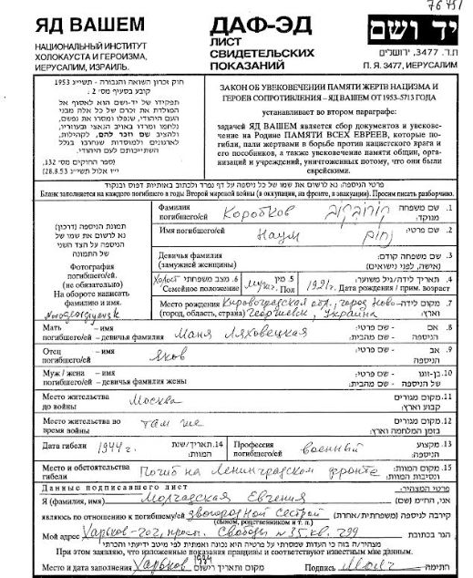 Согласно Листа свидетельских показаний в ЯД-ВАШЕМ его двоюродной сестры Мальчаевской Евгении, Коробков Наум Яковлевич погиб на фронте под Ленинградом в 1944 году.
