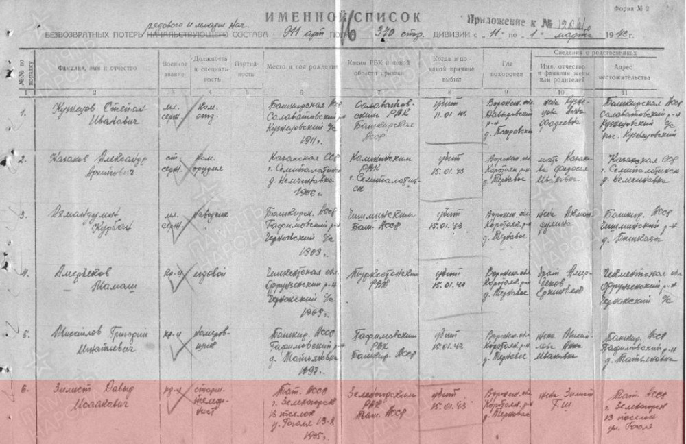 Донесение о безвозвратных потерях Дата рождения: __.__.1905 Место рождения: Татарская АССР Наименование военкомата: Зеленодольский ГВК, Татарская АССР, г. Зеленодольск Дата и место призыва: Зеленодольский ГВК, Татарская АССР, г. Зеленодольск Воинское звание: красноармеец Последнее место службы: 340 сд Воинская часть: 340 сд Дата выбытия: 15.01.1943 Причина выбытия: убит Первичное место захоронения: Воронежская обл., Острогожский р-н, с. Терновое Место призыва: Зеленодольский ГВК, Татарская АССР, г. Зеленодольск Информация об архиве - Источник информации: ЦАМО |