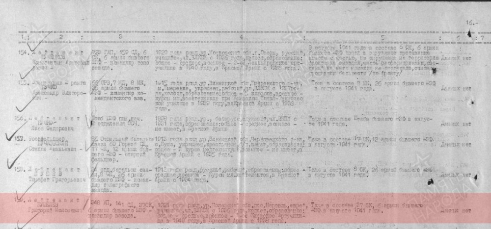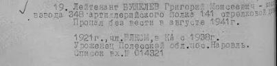 Донесение о безвозвратных потерях Дата рождения: __.__.1921 Место рождения: Белорусская ССР, Полесская обл., Наровлянский р-н, м. Наровль Дата и место призыва: __.__.1938 Воинское звание: лейтенант Последнее место службы: 348 артиллерийский полк Воинская часть: 348 артиллерийский полк Дата выбытия: __.08.1941 Причина выбытия: пропал без вести Место выбытия: Украинская ССР Информация об архиве - Источник информации: ЦАМО |
