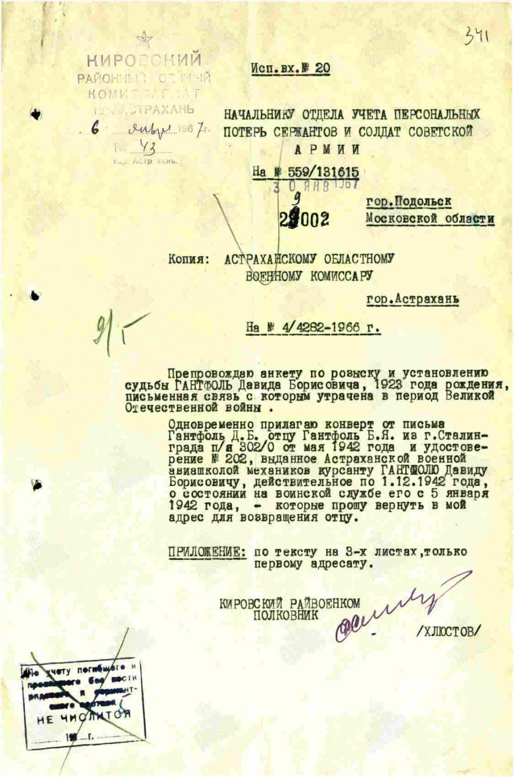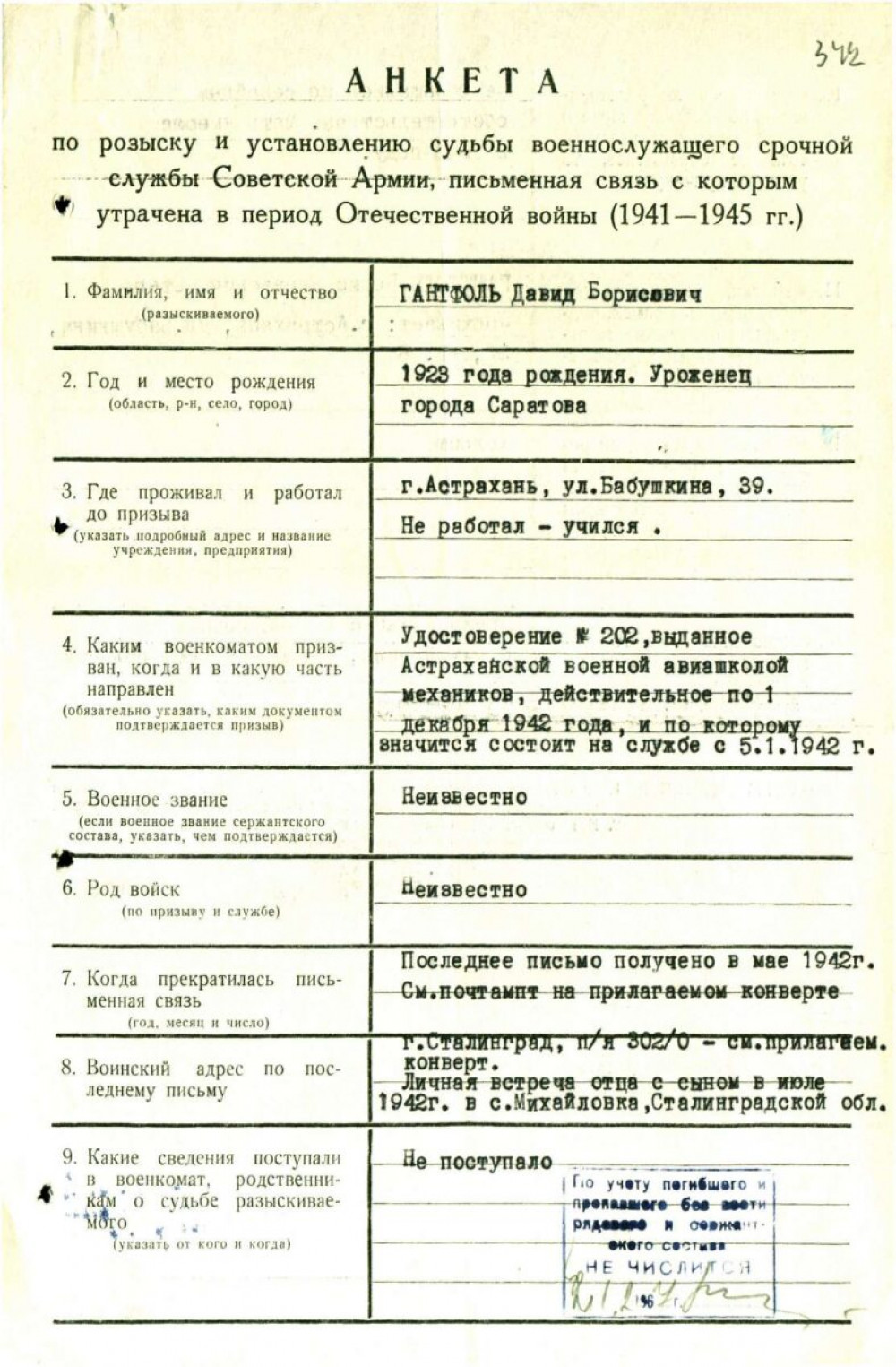 Мой дядя, Гантфоль Давид Борисович, родился 20 мая 1923 года в г. Саратове в семье служащего. Впоследствии жил и учился в Астрахани. В 1941 году окончил 8 классов. Будучи учащимся 9 го класса осенью 1941 года работал санитаром в военном госпитале, находившемся в здании средней школы 10 (ныне консерватория). Там он прошёл начальную военно медицинскую подготовку, получив специальность санинструктора. В декабре того же года был призван в Красную Армию. Учился в Астраханской школе авиамехаников. В апреле 1942 года отправлен в г. Красноармейск Сталинградской области, где, судя по письмам, шло формирование бронетанковой части. В начале мая часть была переброшена на станцию Раковка Сталинградской области. Почтовый ящик 339 / 2. Оттуда дядя сообщает родителям, что он служит санинструктором, и его часть должна называться истребительной бригадой. Он ждал отправки на фронт. В конце июня он находился в Бекетовке, тоже под Сталинградом. Несколько писем из этого населённого пункта домой без почтового ящика. Он писал, что точного адреса пока нет. В июне в Сталинград, в служебную командировку из Астрахани приезжал мой дедушка, Гантфоль Борис Яковлевич, его отец, как раз незадолго до призыва в 28 Армию. Они встречались. Последние два письма и телеграмма от Давида из Бекетовки датированы 7 июля 1942 года. В них он сообщал родителям, что их сажают в эшелон и отправляют в неизвестном направлении. Он должен был служить санинструктором в расположении батареи. Больше о нём никаких сведений не поступало. Извещения о гибели его мать, моя бабушка, на него не получала. После войны, когда мой дед вернулся с фронта, к нему приходил один солдат и рассказывал, что вместе с Давидом садился в эшелон. Началась сильная бомбёжка. Состав полностью был разбит. Было много убитых и раненых. Дядю он больше не видел. Многочисленные запросы деда в Подольск, в газету «Известия», в Военно медицинский музей г. Ленинграда, в наш Военкомат уже после войны ничего не дали кроме извещения, в котором значится, что Давид Гантфоль пропал без вести в сентябре 1942 года под Сталинградом. Воинский адрес по последнему письму: Бекетовка Сталинградской области,Предшествующий: Раковка п/я 339/2. ============ БИОГРАФИЯ. Гантфоль Давид Борисович. Родился 20 мая 1923 года в еврейской семье Бориса (Баруха) и Рахиль Гандфоль в городе Саратов. Перед войной семья жила в городе Астрахань Сталинградской области России, где прошло его детство и юность. В 1941 году он учился в средней школе г. Астрахань. Будучи учащимся девятого класса, осенью 1941 года работал санитаром в военном госпитале, находящимся в здании средней школы №10. Там он прошёл начальную военно-медицинскую подготовку и получил специальность санитарного инструктора (санинструктора). 5 января 1942 года призван в армию Кировским военкоматом г. Астрахань и направлен на учёбу в Астраханскую военную авиационную школу механиков (ВШАМ). В апреле 1942 года отправлен в г. Красноармейск Сталинградской области, где судя по его письмам шло формирование бронетанковой части. В начале мая эта воинская часть была переброшена в село Раковка Сталинградской области, почтовый ящик 339/2. Оттуда он сообщает родителям, что служит санинструктором в медсанчасти, его подразделение должно называться истребительной бригадой. (Возможно 5-я отдельная истребительно-противотанковая артиллерийская бригада (5
