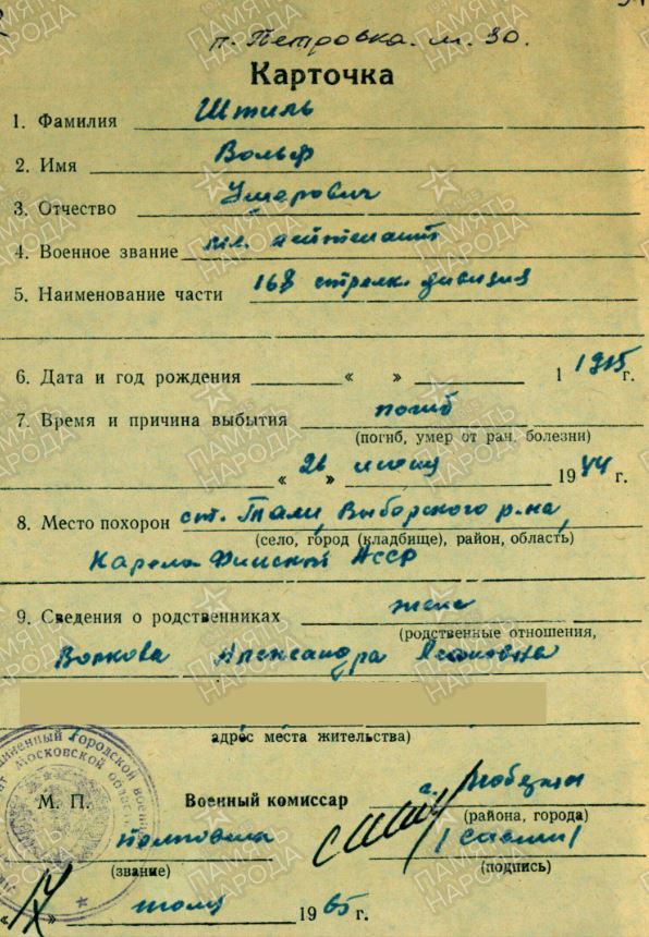 1915-1944. Урож,: г.Ровно, Украина. Призв.: Ухтомским РВК, Московская обл. Мл.лейтенант, переводчик штаба 168 сд. Убит в бою 26.06.1944. Захоронен: ст.Тали. Перезахоронен: Ленинградская обл., Выборгский р-н, п. Петровка, брат. мог. № 30. /ЦАМО, ф.33,оп.11458, д.363, л.116об; д.250/ ==== Штиль Вольф Ушорович Картотека ранений Дата рождения: __.__.1915 Место рождения: Украинская ССР, Ровенская обл., г. Ровно Наименование военкомата: Ухтомский РВК, Московская обл., Ухтомский р-н Дата и место призыва: Ухтомский РВК, Московская обл., Ухтомский р-н Дата призыва: __.07.1941 Воинское звание: мл. сержант Последнее место службы: 142 морсбр Воинская часть: 142 морсбр Дата выбытия: 25.01.1943 Причина выбытия: выбыл в госпиталь 925 Госпиталь: эвакуационный госпиталь 2222 ==== Штиль Вольф Ушерович Документ, уточняющий потери Дата рождения: __.__.1915 Воинское звание: мл. лейтенант Последнее место службы: 168 сд Воинская часть: 168 сд Дата выбытия: 26.06.1944 Причина выбытия: погиб Место захоронения: п. Петровка, могила № 30 Информация об архиве - Источник информации: ВК Ленинградской обл. |