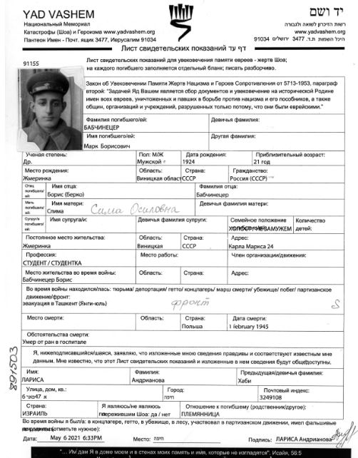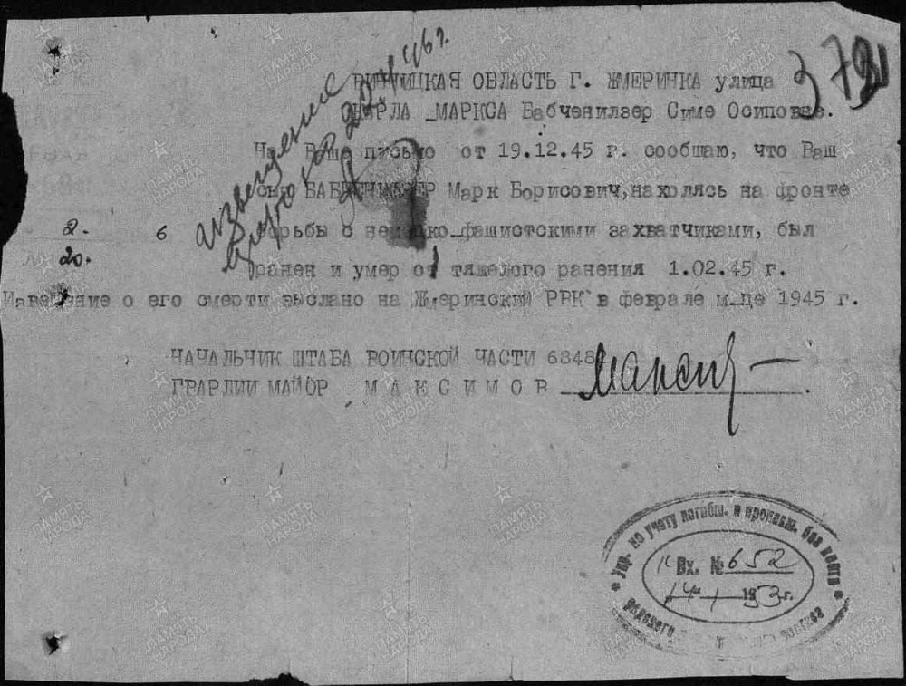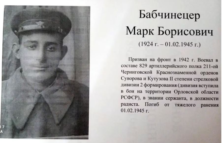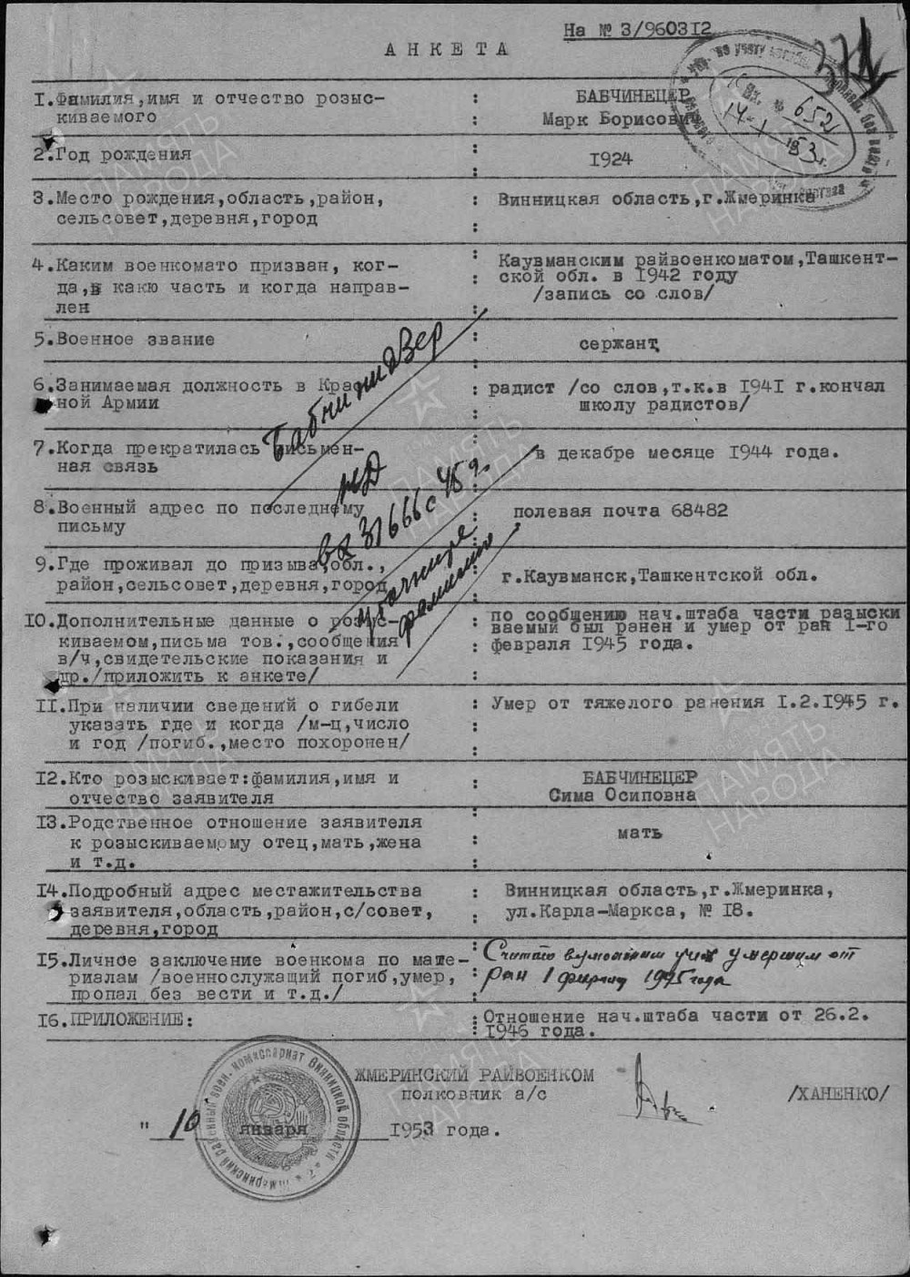 Медаль «За отвагу» Наградной документ Дата рождения: __.__.1924 Наименование военкомата: Янги-Юльский РВК, Узбекская ССР, Ташкентская обл., Янги-Юльский р-н Дата и место призыва: Янги-Юльский РВК, Узбекская ССР, Ташкентская обл., Янги-Юльский р-н Дата поступления на службу: __.__.1942 Воинское звание: красноармеец Воинская часть: 829 ап Кто наградил: 829 ап 211 сд 1 Украинского фронта Наименование награды: Медаль «За отвагу» Номер документа: 31/н Дата документа: 08.11.1944 Место призыва: Янги-Юльский РВК, Узбекская ССР, Ташкентская обл., Янги-Юльский р-н Приказ подразделения №: 31/н от: 08.11.1944 Издан: 829 ап 211 сд 1 Украинского фронта Информация об архиве - Архив: ЦАМО ==== Бабчинецер Марк Борисович Документ, уточняющий потери Дата рождения: __.__.1924 Место рождения: Украинская ССР, Винницкая обл., Жмеринский р-н, г. Жмеринка Дата и место призыва: __.__.1942 Каувманский РВК, Узбекская ССР, Ташкентская обл. Дата призыва: __.__.1942 Воинское звание: сержант Последнее место службы: п/п 68482 Дата выбытия: 01.02.1945 Причина выбытия: умер от ран Информация об архиве - Источник информации: ЦАМО |