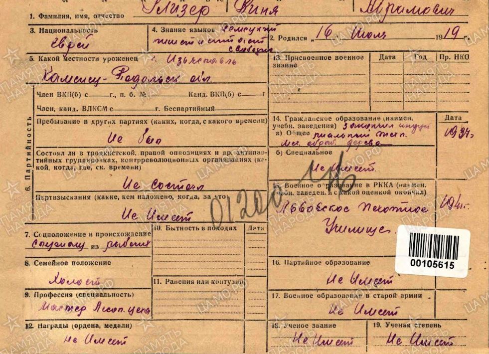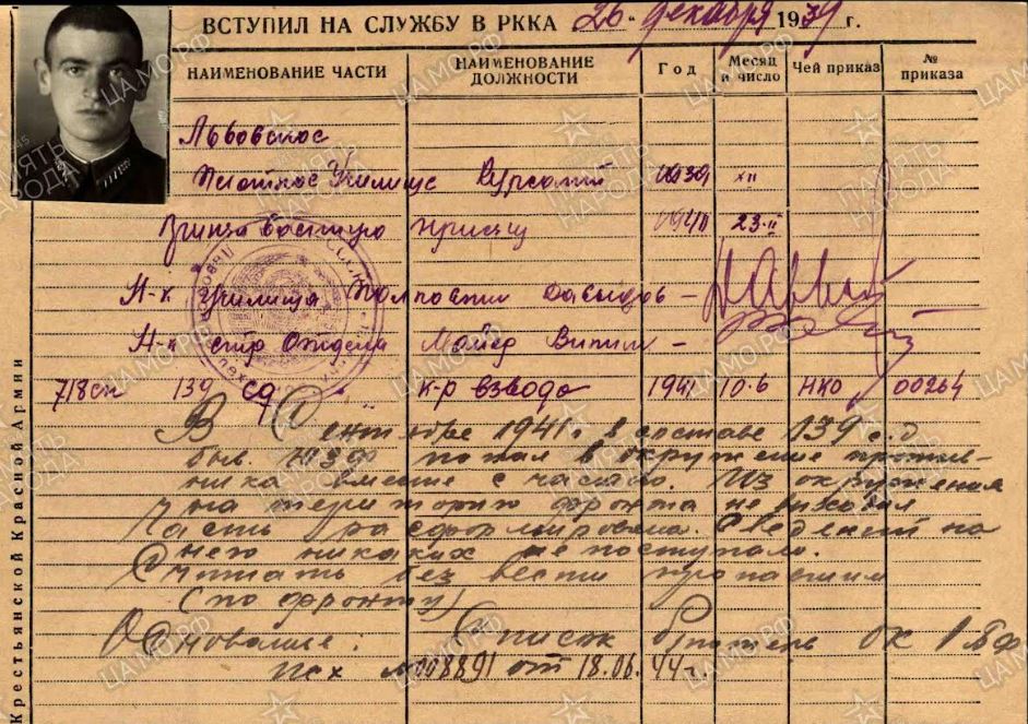 Учетно-послужная картотека Дата рождения: 16.07.1919 Место рождения: Украинская ССР, Каменец-Подольская обл., Изяславский р-н, г. Изяслав Дата поступления на службу: __.12.1939 Воинское звание: лейтенант Воинская часть: 643 сп , 718 стрелковый полк | |