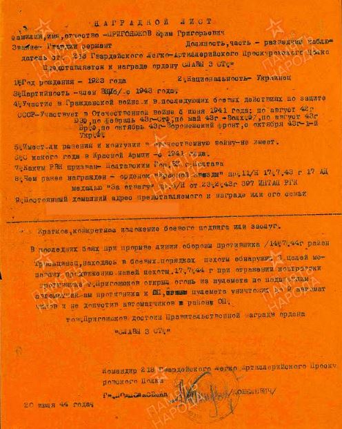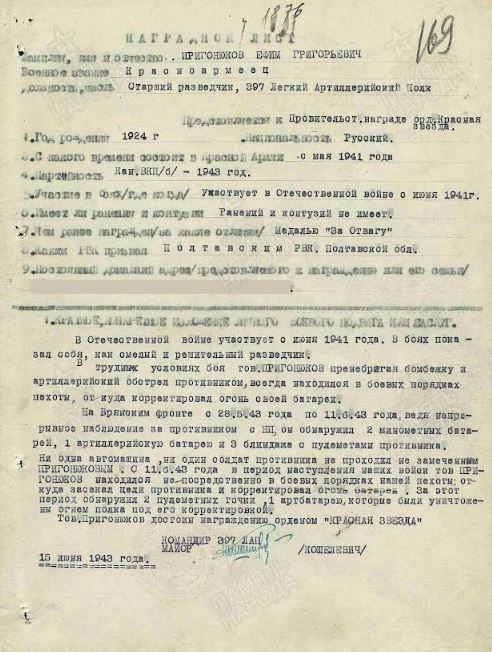 В 218-м гвардейском лёгком артиллерийском полку Ефим Пригонюков служит в взводе разведки полка старшим разведчиком-наблюдателем в звании гвардии сержанта. Задачей разведчиков-наблюдателей было, находясь в наблюдательных пунктах, расположенных перед окопами пехоты или в окопах пехоты, выявлять и передавать по рации координаты целей противника для уничтожения их огнём артиллерии.