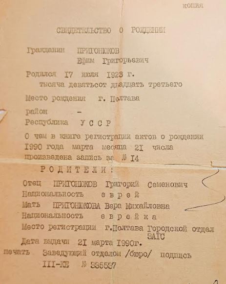 Родился 17 июля 1923 года в городе Полтава в еврейской семье Григория и Веры Пригонюков. В 1929 году родители умерли и шестилетний Ефим был отдан на воспитание в Полтавский детский дом имени Кирова. Окончил девять классов и пошёл на завод работать токарем. На заводе был избран комсоргом цеха.